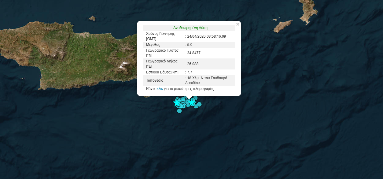 Είναι κοντά στη Χέρσο, πρέπει να έγινε ιδιαίτερα αισθητός σε όλο το Λασίθι και στην υπόλοιπη Κρήτη. Αυτή τη στιγμή υπολογίζεται το ακριβές μέγεθος και η ακριβής θέση, στα 5 χιλιόμετρα είναι επιφανειακός ο σεισμός, αλλά τα επιμέρους στοιχεία και τα ακριβή στοιχεία θα τα ξέρουμε σε λίγη ώρα».