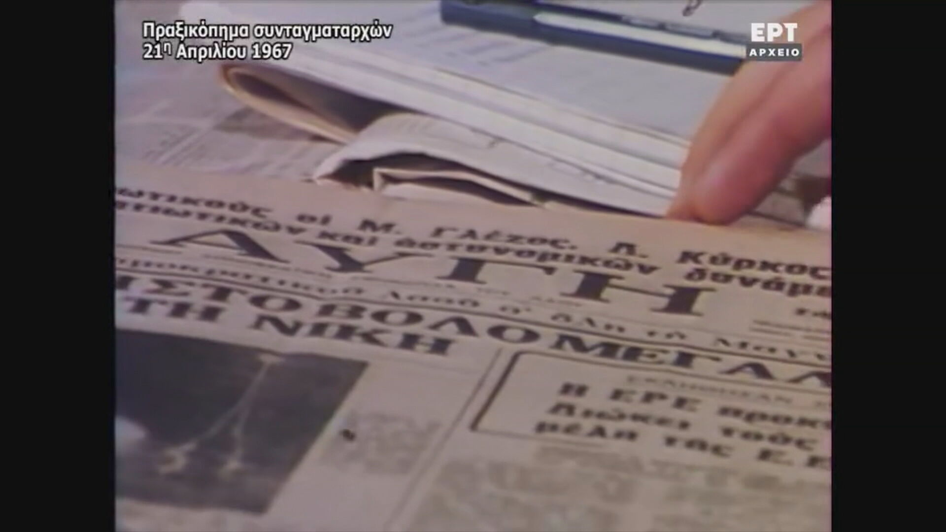 Το Αρχείο της ΕΡΤ, με αφορμή την επέτειο από την εκδήλωση του πραξικοπήματος της 21η Απριλίου 1967, παρουσιάζει απόσπασμα από επεισόδιο της εκπομπής «Εδώ και Σήμερα» με τίτλο «Οι Πρώτες σελίδες που πρόλαβε η χούντα – 21 Απριλίου». Θέμα της εκπομπής είναι τα γεγονότα που έλαβαν χώρα τις πρώτες ώρες της εκδήλωσης του πραξικοπήματος και ειδικότερα τα πρωτοσέλιδα των εφημερίδων που επρόκειτο να κυκλοφορήσουν, καθώς και η αναστολή λειτουργίας τους εκείνη την ημέρα.