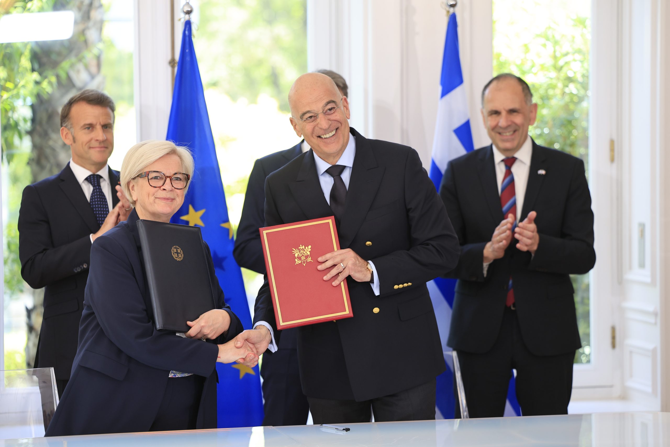 Ο Υπουργός Εθνικής Άμυνας, Νίκος Δένδιας, συναντήθηκε σήμερα, Σάββατο 25 Απριλίου 2026, με την Υπουργό Ενόπλων Δυνάμεων της Γαλλίας, Catherine Vautrin, επί της Φρεγάτας ΚΙΜΩΝ, στο πλαίσιο της επίσκεψης του Προέδρου της Γαλλικής Δημοκρατίας, Emmanuel Macron, στην Ελλάδα. Κατά τη συνάντηση, στην οποία συμμετείχαν επίσης ο Αρχηγός ΓΕΕΘΑ Στρατηγός Δημήτριος Χούπης, ο Αρχηγός ΓΕΝ Αντιναύαρχος Δημήτριος – Ελευθέριος Κατάρας ΠΝ και αντιπροσωπείες των δύο πλευρών, συζητήθηκε η περαιτέρω εμβάθυνση της αμυντικής συνεργασίας μεταξύ της Ελλάδας και της Γαλλίας, καθώς και οι εξελίξεις ασφάλειας στην ευρύτερη περιοχή.