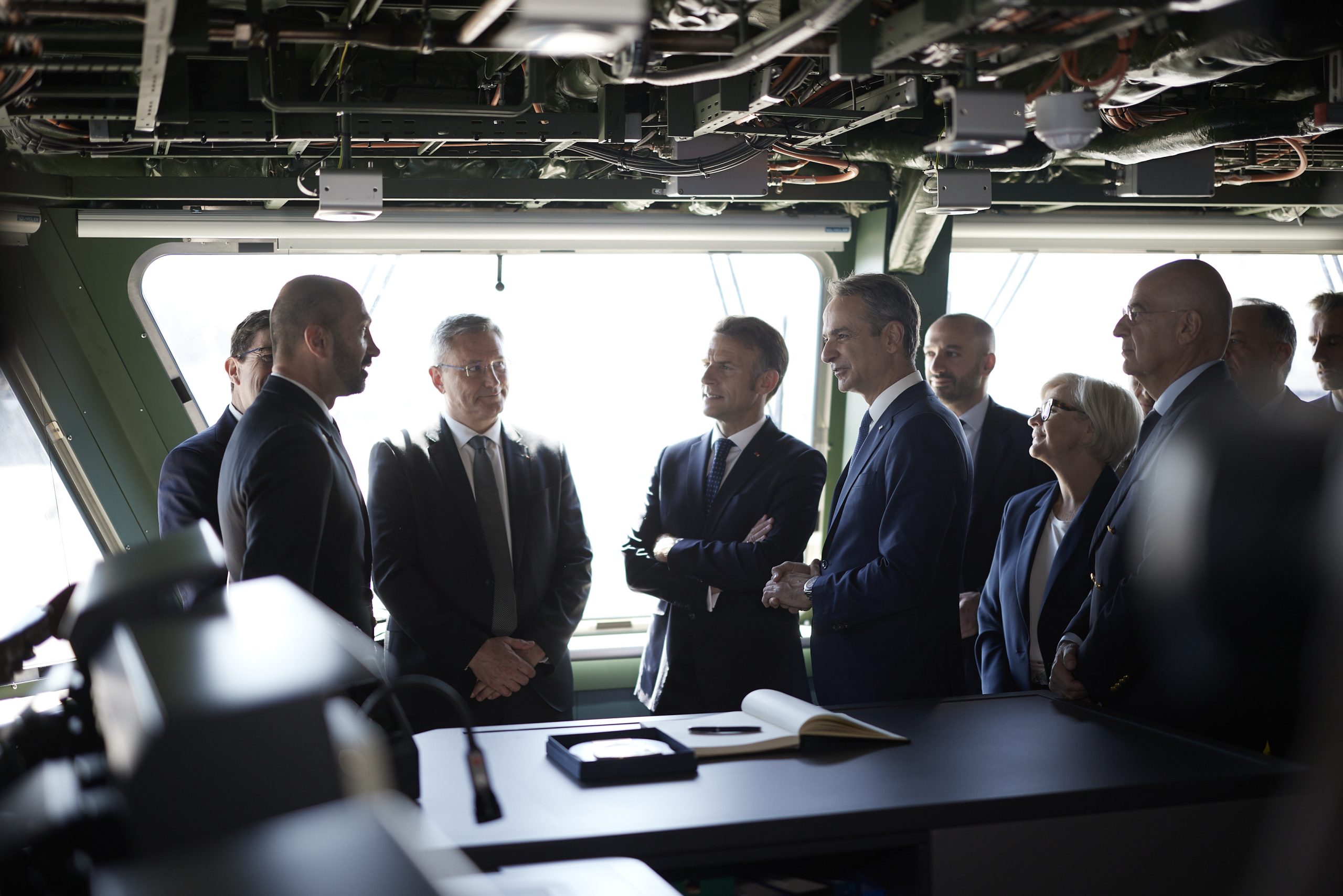 Στη συνέχεια, οι δύο ηγέτες μετέβησαν στη γέφυρα της φρεγάτας, ενώ η επίσκεψη κορυφώθηκε με εντυπωσιακές υπερπτήσεις μαχητικών Dassault Rafale πάνω από το πλοίο.