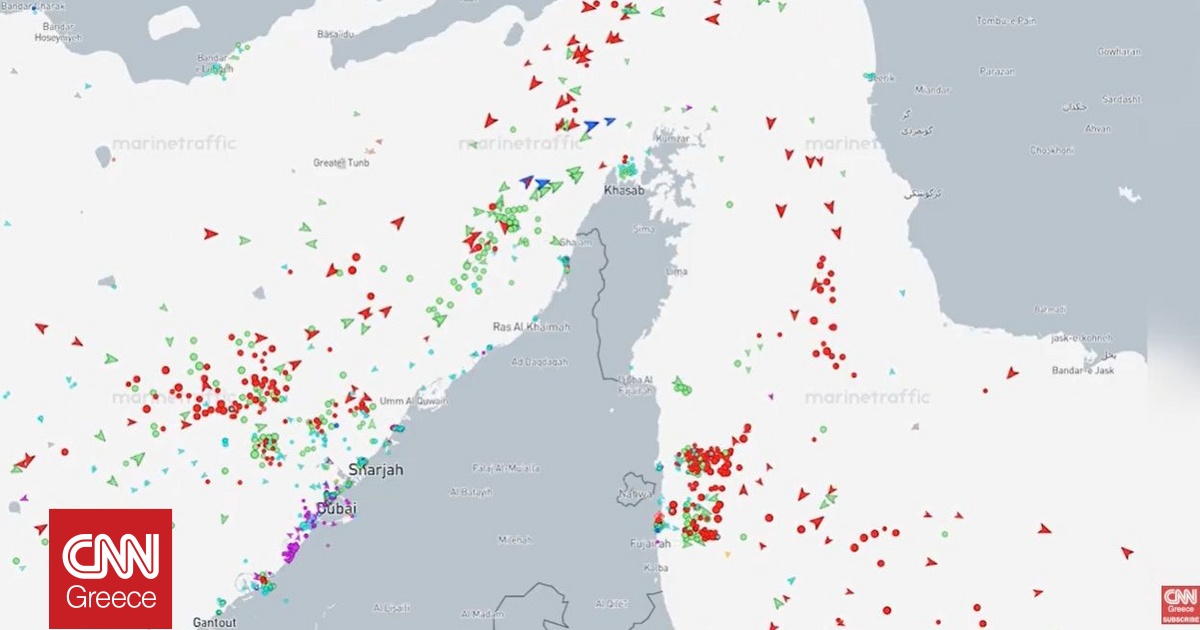 Δεξαμενόπλοια φαίνονται να αλλάζουν πορεία και να κάνουν στροφή στην πλευρά του Περσικού Κόλπου στα Στενά του Ορμούζ, όπως δείχνουν δεδομένα παρακολούθησης από…