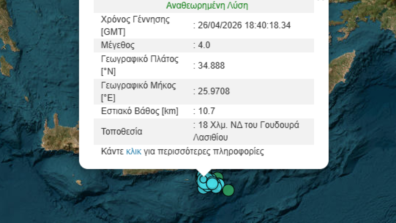 Νέα σεισμική δόνηση σημειώθηκε την Κυριακή ανοιχτά του Λασιθίου Κρήτης.