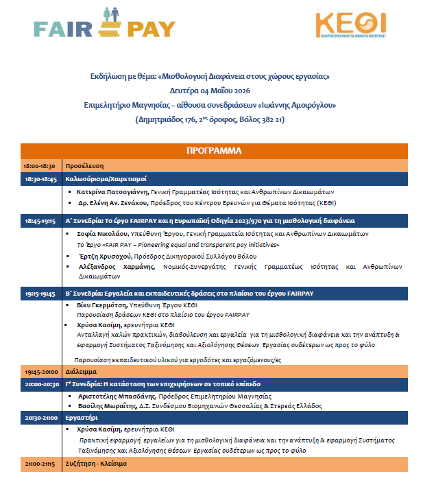 Την ερχόμενη Δευτέρα, 4 Μαΐου 2026, διοργανώνεται στον Βόλο εκδήλωση με θέμα «Μισθολογική Διαφάνεια στους χώρους εργασίας», από το Κέντρο Ερευνών για Θέματα Ισότητας (ΚΕΘΙ) σε συνεργασία με το Επιμελητήριο Μαγνησίας. Η εκδήλωση θα πραγματοποιηθεί από τις 18:00 έως τις 21:15, στην αίθουσα συνεδριάσεων «Ιωάννης Αμοιρόγλου» του Επιμελητηρίου Μαγνησίας (Δημητριάδος 176, 2ος όροφος).