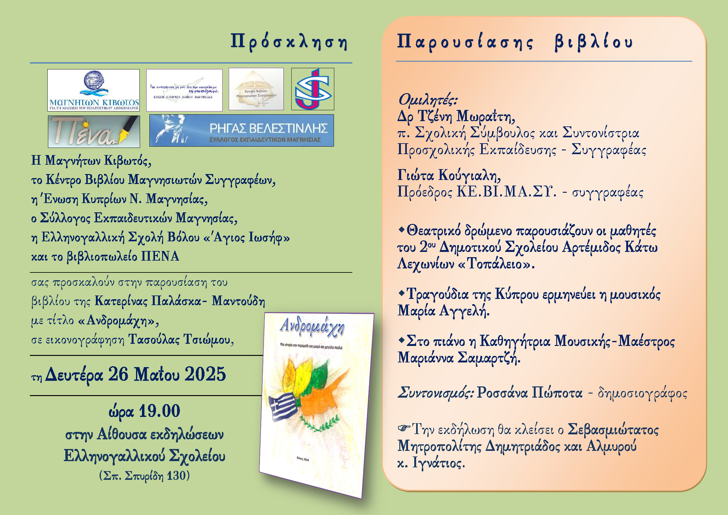 Τη Δευτέρα 26 Μαΐου 2025, στις 19.00, στην Αίθουσα εκδηλώσεων του Ελληνογαλλικού Σχολείου (Σπ. Σπυρίδη 130) θα παρουσιαστεί το βιβλίο για παιδιά της Κατερίνας Παλάσκα – Μαντούδη με τίτλο: «Ανδρομάχη», σε εικονογράφηση Τασούλας Τσιώμου.