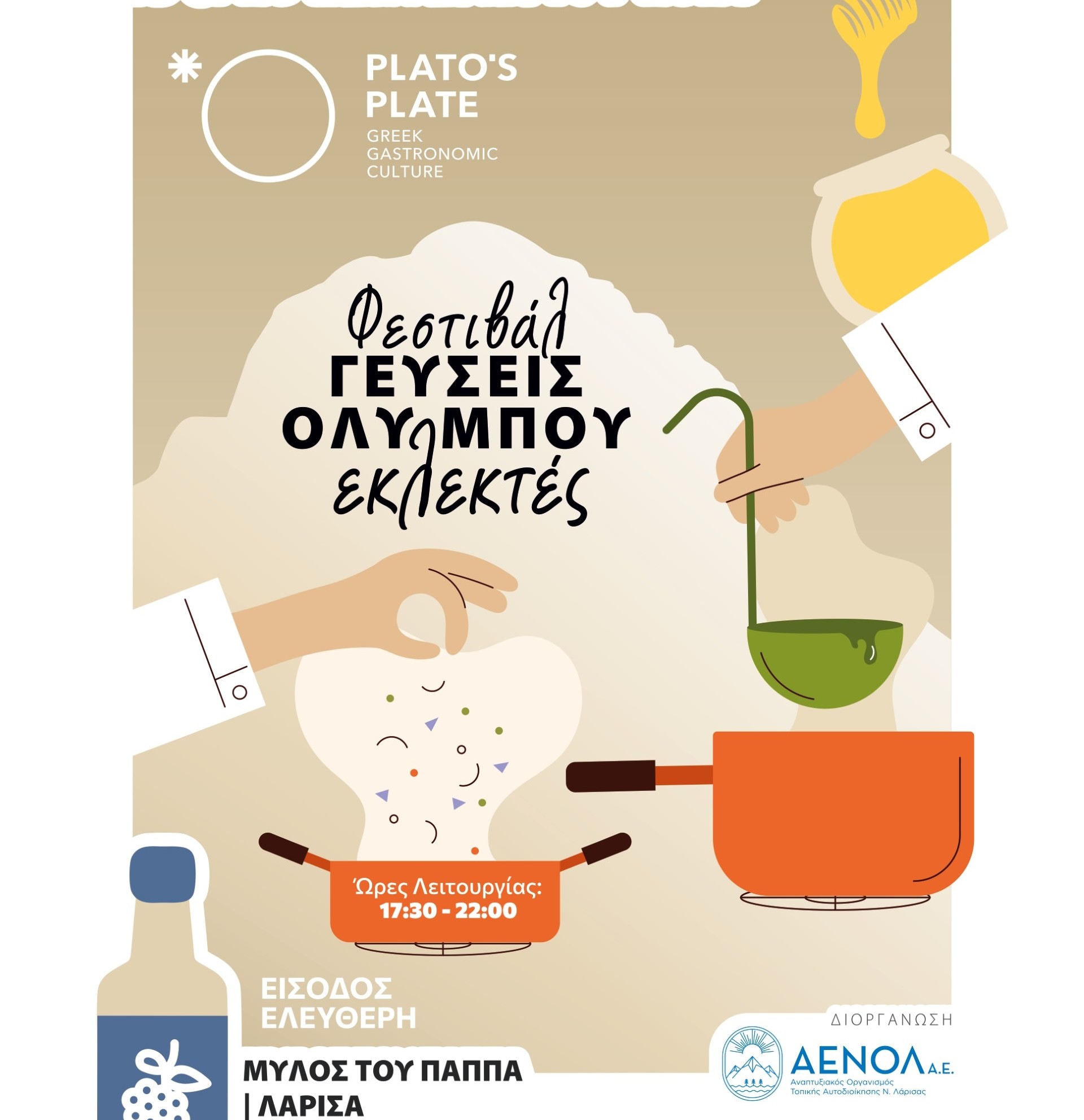 Ένα διήμερο αφιερωμένο στη γαστρονομία, τον πολιτισμό και τα εκλεκτά προϊόντα του Ολύμπου και του ν. Λάρισας θα πραγματοποιηθεί στις 19 & 20 Σεπτεμβρίου 2025 στο χώρο του Μύλου του Παππά με ελεύθερη είσοδο για το κοινό από τον Αναπτυξιακός Οργανισμός Τοπικής Αυτοδιοίκησης Νομού Λάρισας «ΑΕΝΟΛ Α.Ε.».