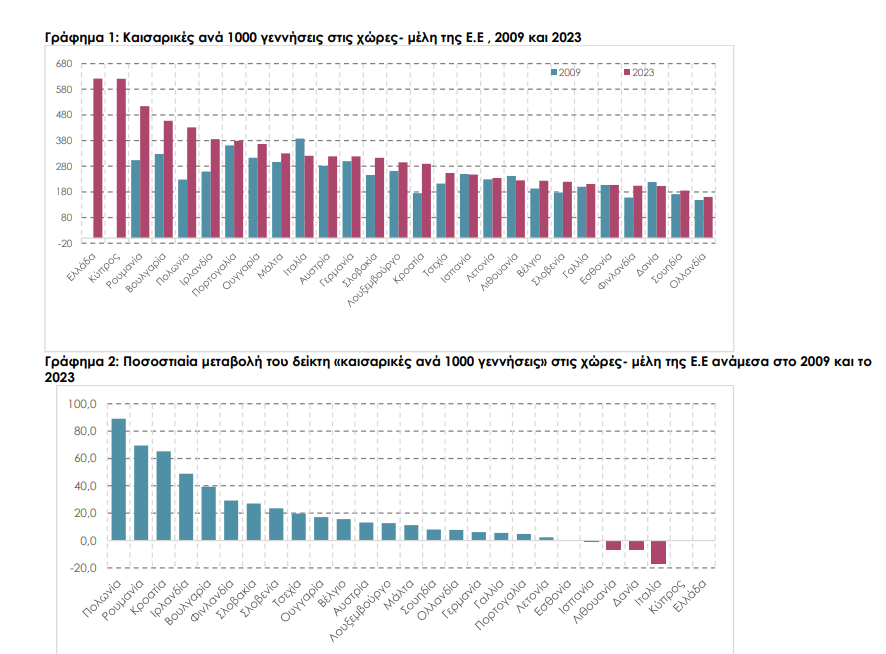 Σύμφωνα με την ανάλυση που βασίζεται σε στοιχεία της Eurostat, ο δείκτης «καισαρικές ανά 1.000 γεννήσεις» στην Ελλάδα ανήλθε το 2023 στις 621 ανά 1.000, επίπεδο υπερτριπλάσιο σε σχέση με χώρες όπως η Ολλανδία, η Σουηδία, η Σλοβενία, η Εσθονία, το Βέλγιο και η Γαλλία, όπου ο αντίστοιχος δείκτης δεν ξεπερνά τις 200 ανά 1.000 γεννήσεις.