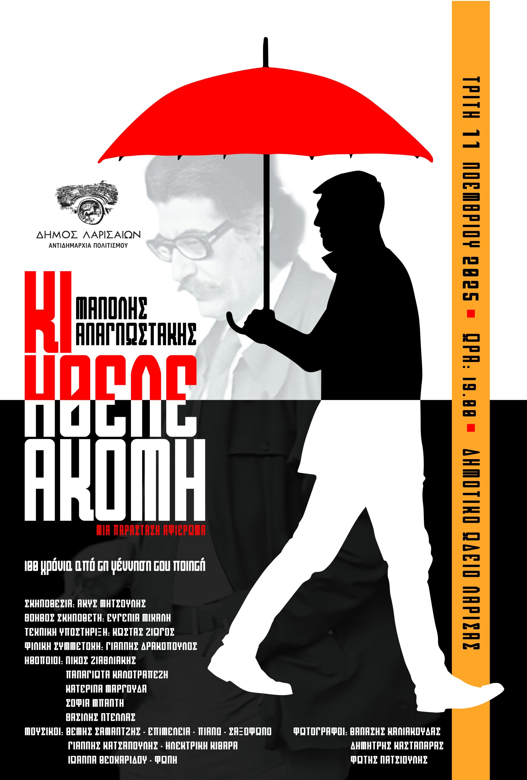Θεατρική παράσταση – αφιέρωμα στον σπουδαίο ποιητή της μεταπολεμικής γενιάς, Μανόλη Αναγνωστάκη, με τίτλο “Μανόλης Αναγνωστάκης κι ήθελε ακόμη”, διοργανώνει η Αντιδημαρχία Πολιτισμού του Δήμου Λαρισαίων, με αφορμή τη συμπλήρωση 100 χρόνων από τη γέννησή του, την Τρίτη 11 Νοεμβρίου 2025 στις 7 το απόγευμα, στο Δημοτικό Ωδείο Λάρισας.