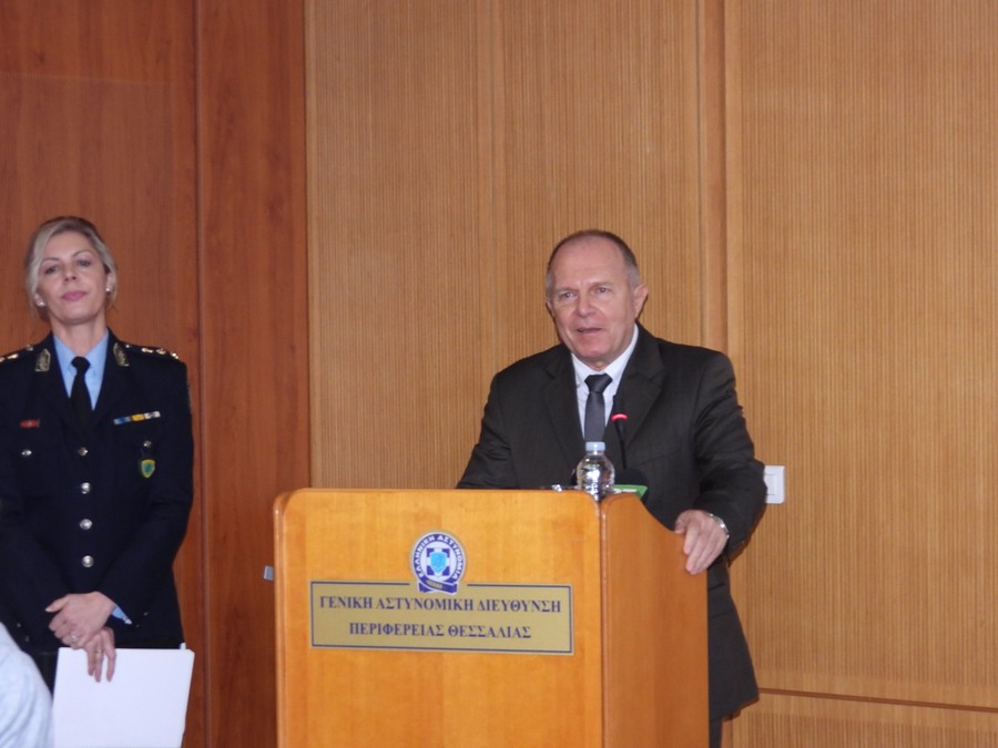 Στη συνέχεια, έλαβε πρώτος τον λόγο ο απερχόμενος Γενικός Περιφερειακός Αστυνομικός Διευθυντής Θεσσαλίας που προέβη σε μία σύντομη αναφορά στον υπηρεσιακό του βίο, με έκδηλη την φόρτιση στο πρόσωπό του, εκφράζοντας την συμπαράστασή του στους αστυνομικούς που συνεχίζουν την υπηρέτηση, τονίζοντας ότι η ιδιότητα του αστυνομικού παραμένει αναλλοίωτη στη συνείδηση του κάθε ένστολου.