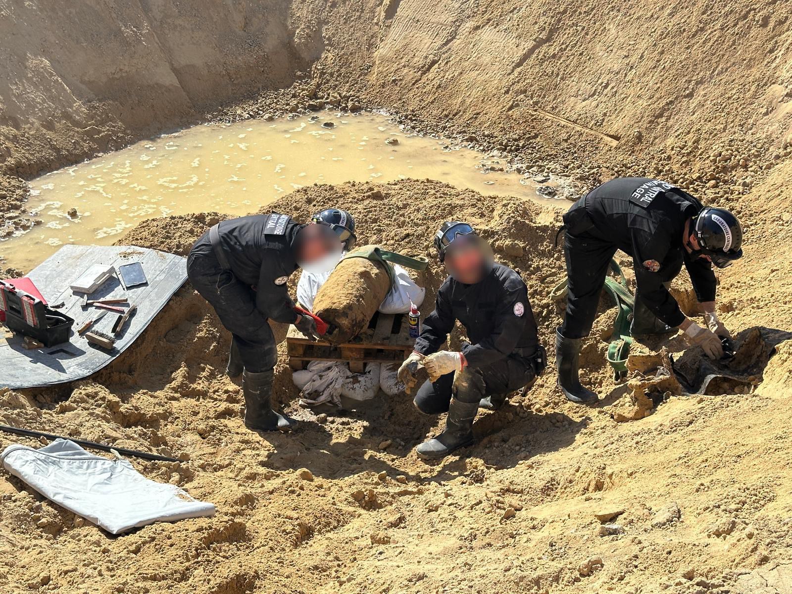 Οι εικόνες της επιχείρησης έδειχναν το βαρύ, σκουριασμένο μεταλλικό λείψανο να βρίσκεται στον πυθμένα ενός αμμώδους λάκκου, σταθερά στερεωμένο από χοντρές, ακατέργαστες ξύλινες δοκούς ενσωματωμένες μπροστά από τσιμεντένιους τοίχους. Στη συνέχεια, απαιτήθηκαν εκτεταμένες εργασίες κάλυψης για την απόσβεση της έκρηξης.