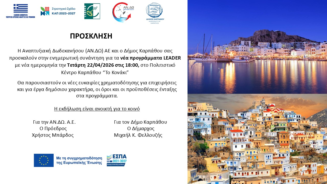 Ενημερωτική συνάντηση για τις νέες χρηματοδοτικές ευκαιρίες του προγράμματος LEADER διοργανώνουν η Αναπτυξιακή Δωδεκανήσου και ο Δήμος Καρπάθου.