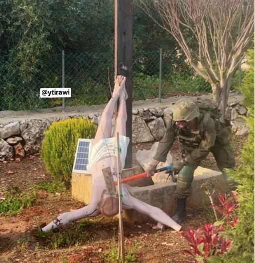 Η φωτογραφία, που τραβήχτηκε στο χριστιανικό χωριό Ντέμπελ, δείχνει τον Σταυρό του Χριστού να είναι ανάποδα στο έδαφος και έναν Ισραηλινό στρατιώτη να χτυπάει το κεφάλι του Ιησού με ένα σφυρί ή ένα τσεκούρι.