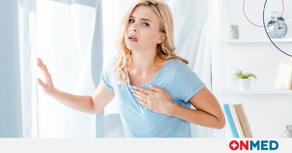 - Έντονο ή σφιχτό πόνο στο στήθος με δύσπνοια, αίσθημα παλμών, εφίδρωση, τρέμουλο ή ζάλη.