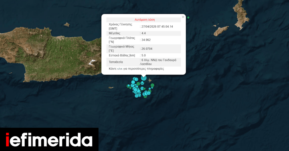 Λίγα λεπτά αργότερα σημειώθηκε σεισμος 4 Ρίχτερ, 16 Χλμ. Ν του Γουδουρά Λασιθίου