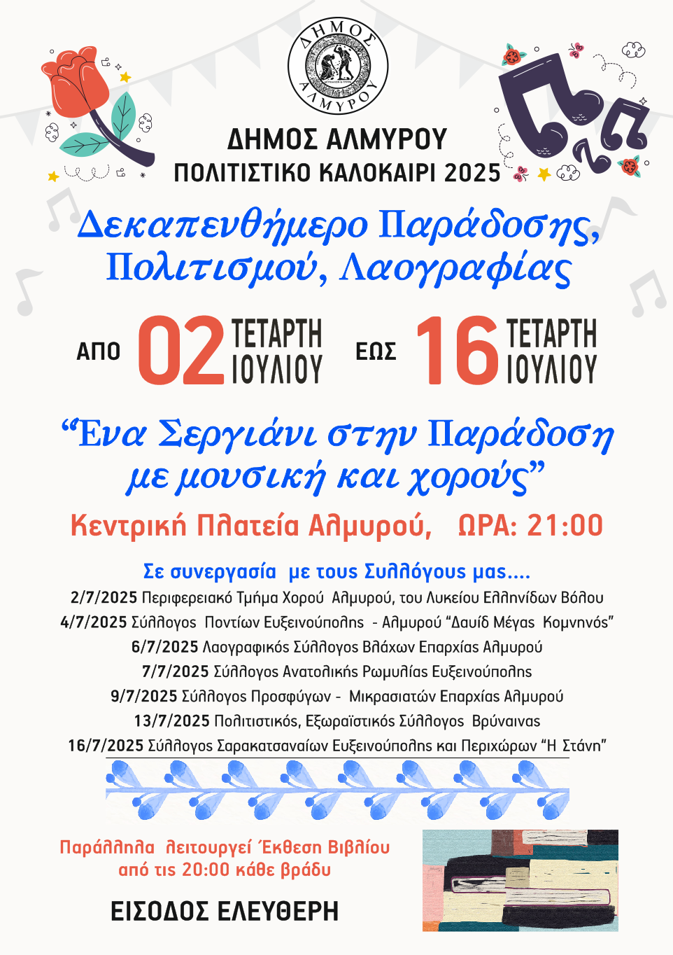 Από τις 2 έως τις 16 Ιουλίου στην Κεντρική Πλατεία Αλμυρού, ένα 15ήμερο Παράδοσης, Πολιτισμού & Λαογραφίας, στα πλαίσια του “Καλοκαιριού Πολιτισμού 2025”.