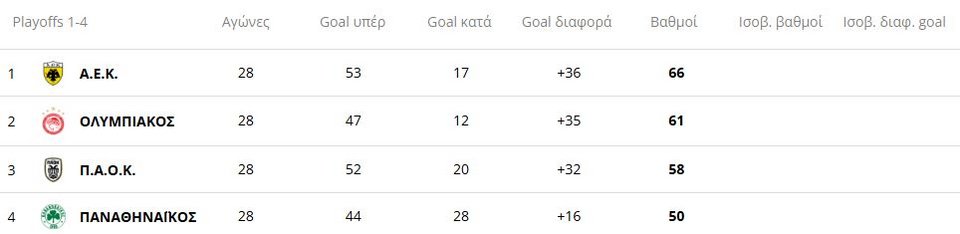Η βαθμολογία της Super League μετά την 2η αγωνιστική των play-offs για τις θέσεις 1-4